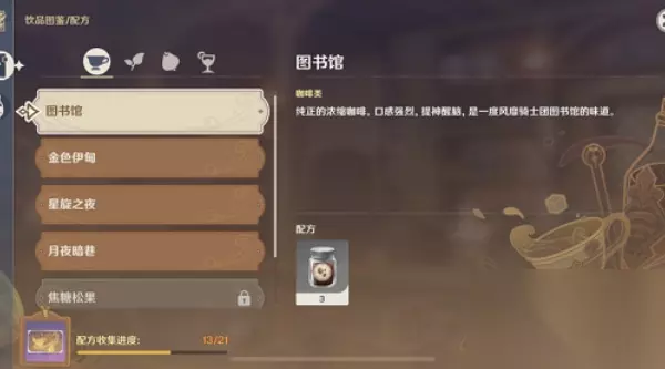 咖啡类有图书馆,金色伊甸,星璇之夜和月夜暗巷这四种。