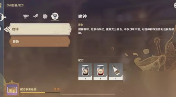 原神调酒配方有,晚钟,加入一份咖啡,一份红茶和一份牛奶,暮色,一份红茶和两份果汁,图书馆,三份咖啡,金色伊甸,两份咖啡加一份牛奶,星璇之夜,一份咖啡加两份牛奶。 【相关推荐:前瞻直播观看指南】 原神调酒配方大全 调酒是限定活动曲生酌微梦中的一项有趣玩法,完成调酒任务后可以获得原石和名片等奖励。 鸡尾酒有晚钟和暮色,晚钟需要加入一份咖啡,一份红茶和一份牛奶,暮色需要一份红茶和两份果汁。