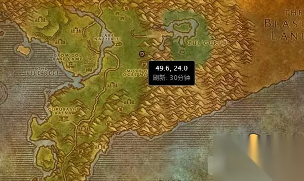 上面是巴尔瑟拉的刷新点之一,并不是一定在此刷新还有【48,20】【49,27】等地点,刷新时间间隔为半个小时,正在做这项任务的玩家可以在这几个点间多来回走动,在刷新期间提高偶遇的概率。这个任务最让人血压升高的环节往往就是一直找不到它,结果在路上跑的时候碰到别的怪一直打个不停说不定还要迷路,这任务确实妥妥的折磨王。 任务开始 在荆棘谷纳菲瑞提湖北面找艾尔加丁爵士领取该任务,坐标为(35.5,10.6)。 任务要求 杀死巴尔瑟拉,并将它的牙齿交给爵士。 任务进行 前往荆棘谷莫什奥格食人魔山的北方,坐标(49.6,24),杀死巴尔瑟拉并拿到它的牙齿。 任务奖励 黑豹猎人护腿。 3150点经验。