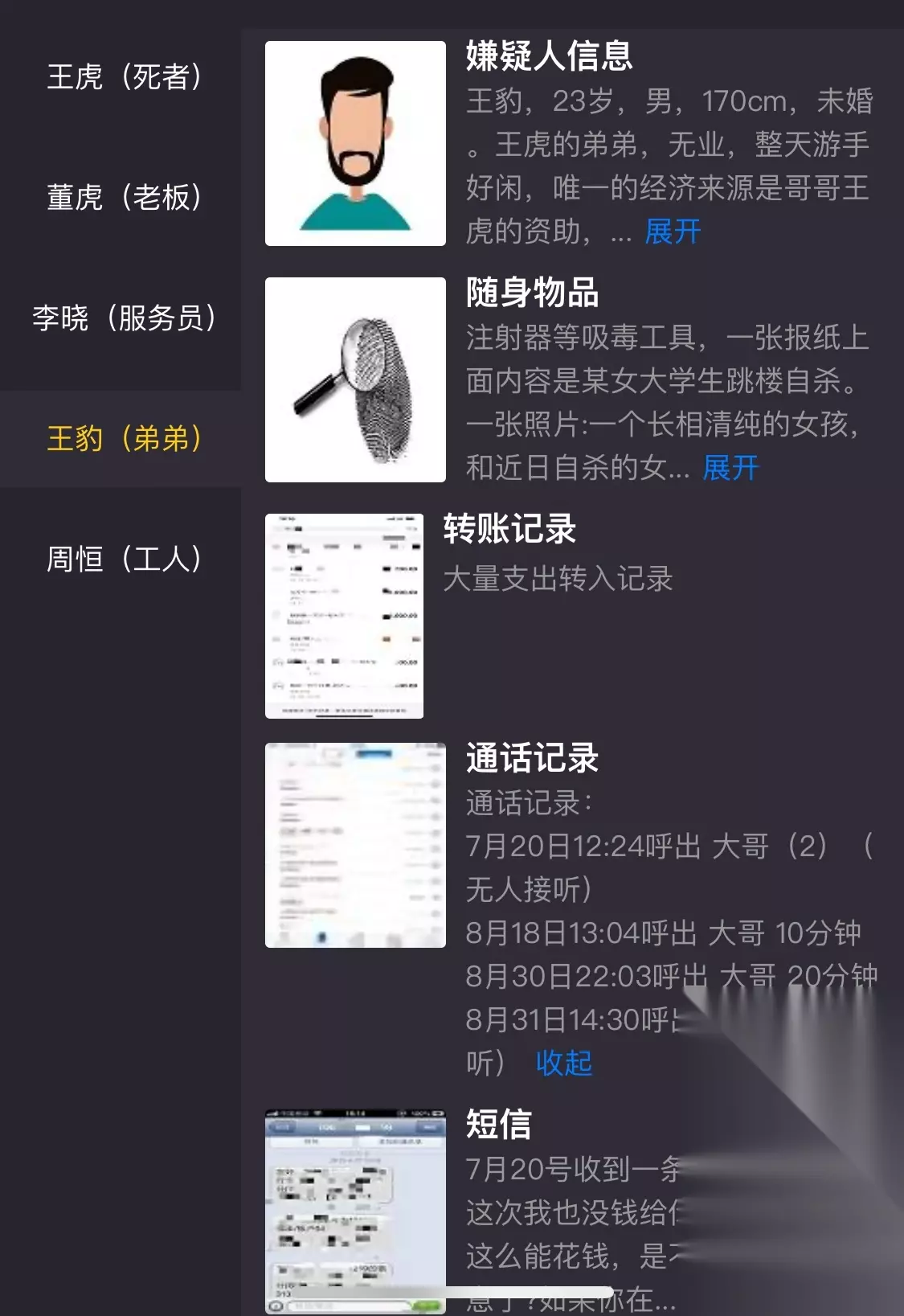 犯罪大师祸根苗案件全解析 今天早上犯罪大师又搞了个新案件祸根苗,还是刑事案件那种。我们这些侦探玩家得赶紧跟着线索走一走,看看能不能破了这个案子。这案子逻辑有点绕,要是没理顺的话,快来看看我们是怎么分析的。 案件里头,凶手到底是谁呢?我们猜是王豹。为啥这么说呢?你看死者那几张女性裸照,还有他弟弟那个女大学生跳楼的事。我们怀疑那个女大学生就是被死者害死的。弟弟天天跟着哥,查到这些信息很正常。再说,弟弟那工具(指涉不良行为),明显是染上坏毛病了,天天向哥要钱。哥能忍?估计是警告过弟弟,再不改就送去劳教。这弟弟能甘心吗?加上女朋友被哥害死,还有哥那句话,怒火中烧,王豹的杀心就上来了。所以,见哥的时候,一怒之下就把他杀了。 凶手是王豹,动机是愤怒和报复。 死者有罪证,比如裸照 弟弟被逼无奈 女朋友也死了 我们分析完这些,就等着晚上官方公布结果。要是推理对了,那真是巧合;要是错了,也正常,毕竟我们只是根据线索瞎猜的。各位侦探们,可以参考一下。要是有什么新进展,或者我们拼凑出更完整的证据链,会第一时间更新。大家多关注就好。