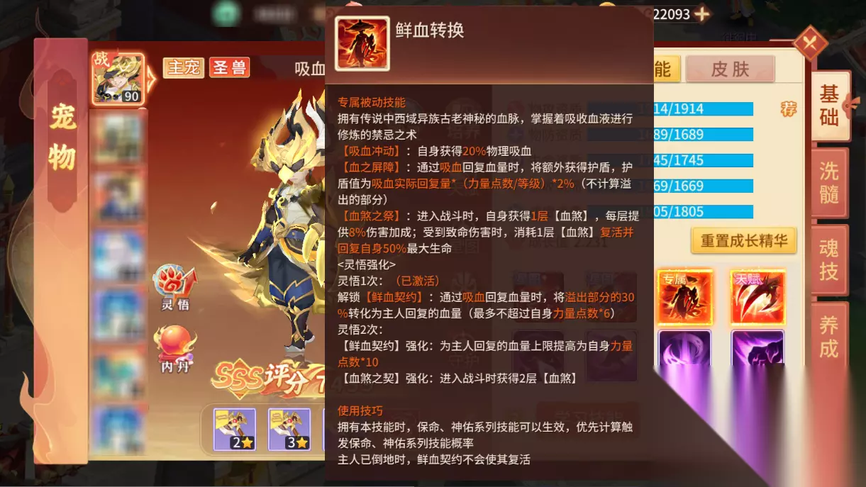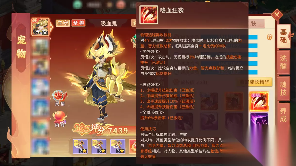 技能机制:新圣兽·吸血鬼技能机制在【灵悟】机制和新星图技能加成下比较复杂,主动技能【嗜血狂袭】物理远程群攻技能,稳定2次秒4群攻,物攻提升计算方式尤为独特,比较自身和目标的力量/智力加点总和,这样的独特技能,可以让吸血鬼在面对以加体为主的肉宠有较大的物攻提升,从而达到克制肉宠的目的,【灵悟】后能够进一步提升伤害。
