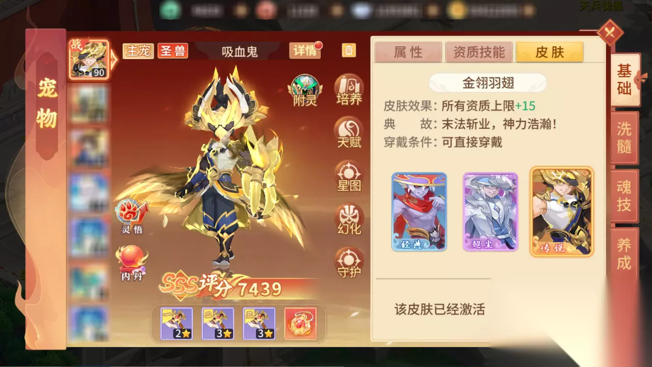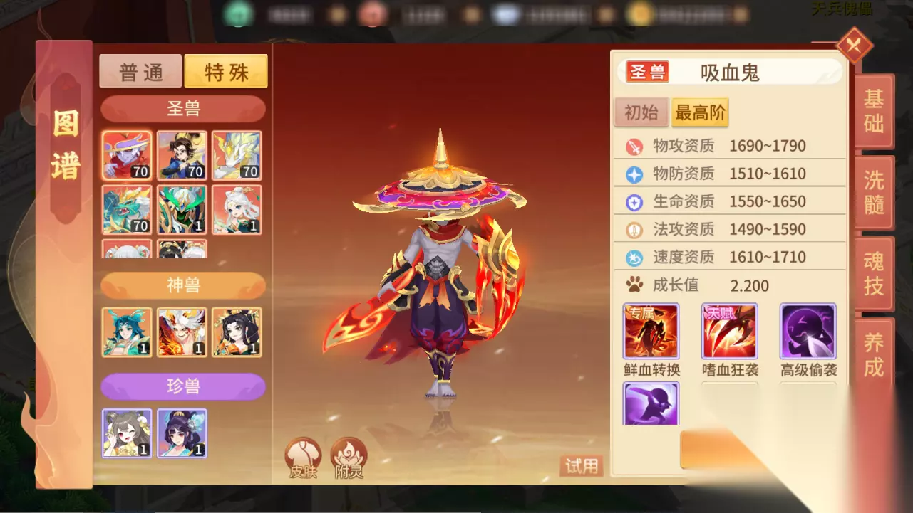 其他技能推荐: 圣兽技能数有限,得益于吸血鬼优秀的天赋被动,内丹反而没那么重要,以下技能修士们可参考选择: 敏捷:敏攻宠提升速度先手击杀,吸血鬼也先手叠加护盾增加战场保命率; 偷袭:针对目前各种反伤盾及反震,特别在于克制近期PVP战场出场率较高的【李靖】道兵技能【复仇之光】反伤护盾,配合天赋三阶【出其不意】还能增伤,偷袭技能的含金量还在提升! 感知:主要是针对近期较多的合宠后多技能的隐攻宠物,御鬼道:你是在点我吗? 保命/神佑:修振奋:PVP中应对对方天威控制(有内丹可以加,没内丹兽魂可以选静心); 修士们自由选择,保命概率高,更适合能够吸血的物理宠物;