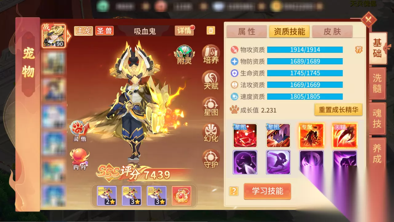 从宠物资质成长可以看到,新圣兽·吸血鬼在物攻资质和速度资质是最高的,同时也略高于近期其他宠物,面板的强势+技能机制独特,让吸血鬼也强势成为近期PVP战场的新星,加点上以力量为主,因为技能回血与力量加点相关,所以推荐4力1速或者全力都可以,作为敏攻宠物,推荐加点速度,先手通过回血获得护盾,增加存活率;