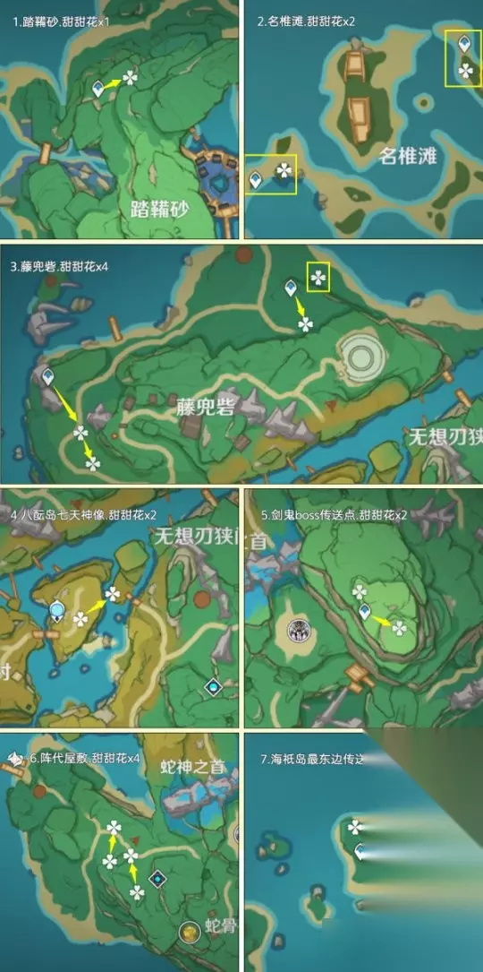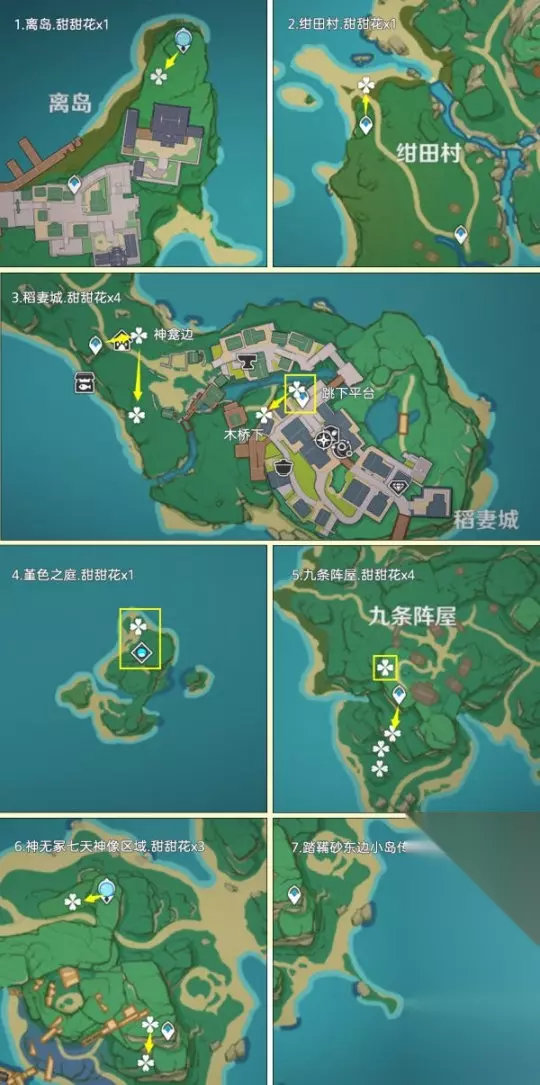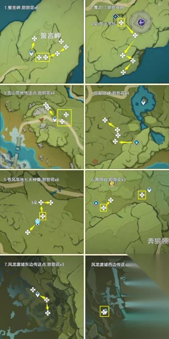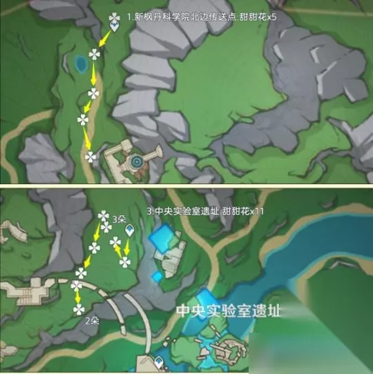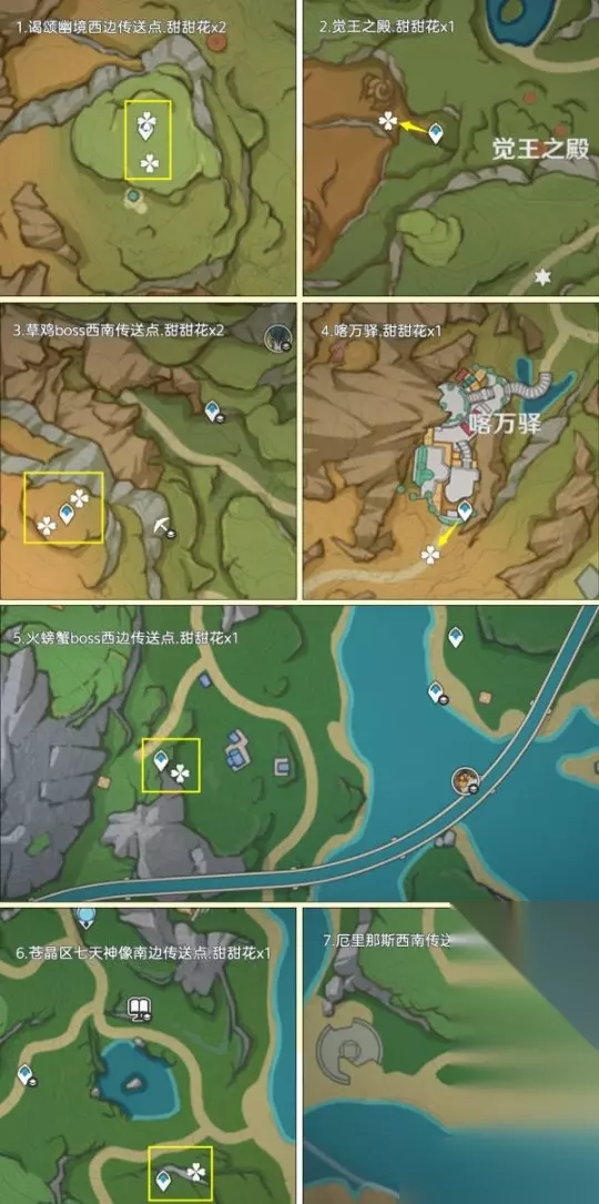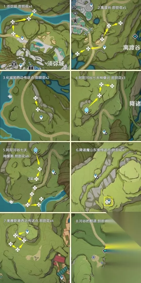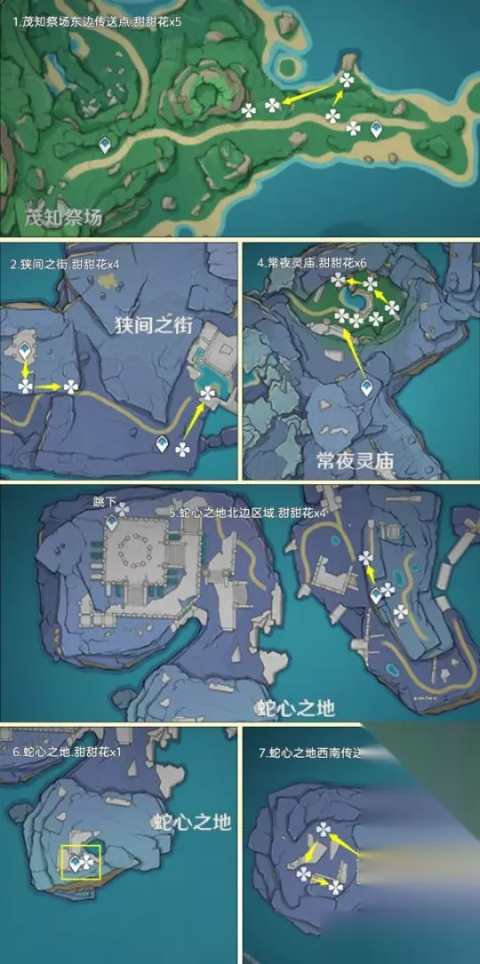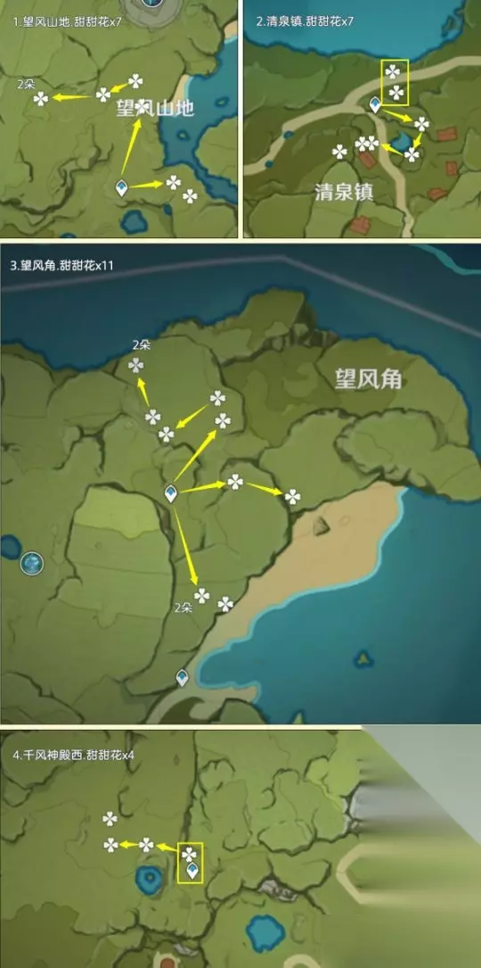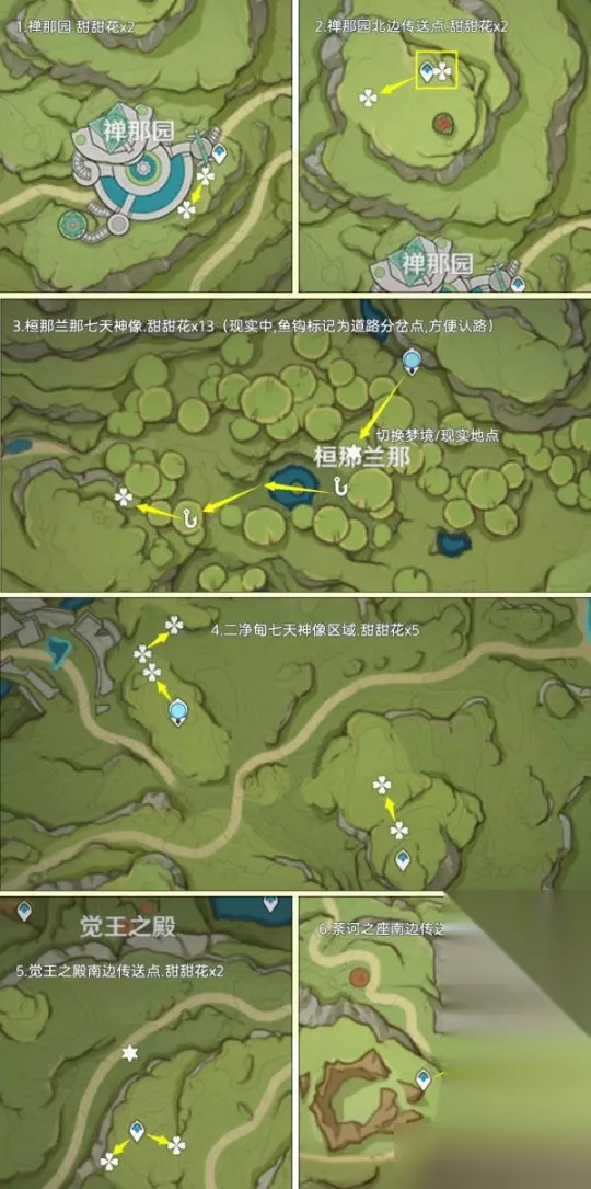 一、前言:关于甜甜花的小知识 该路线推荐玩家:缺少甜甜花的玩家,由于制作料理需要大量的糖,估计还是得跑一趟的 关于阵容:双风阵容,成男体型也行,还有纳西妲拍照扫码,盲扫一堆素材 关于刷新时间:每天0点刷新,获取无上限 个人建议:先去NPC购买糖,80罐糖换算为160朵甜甜花了;采集时切换到夜晚,方便寻找