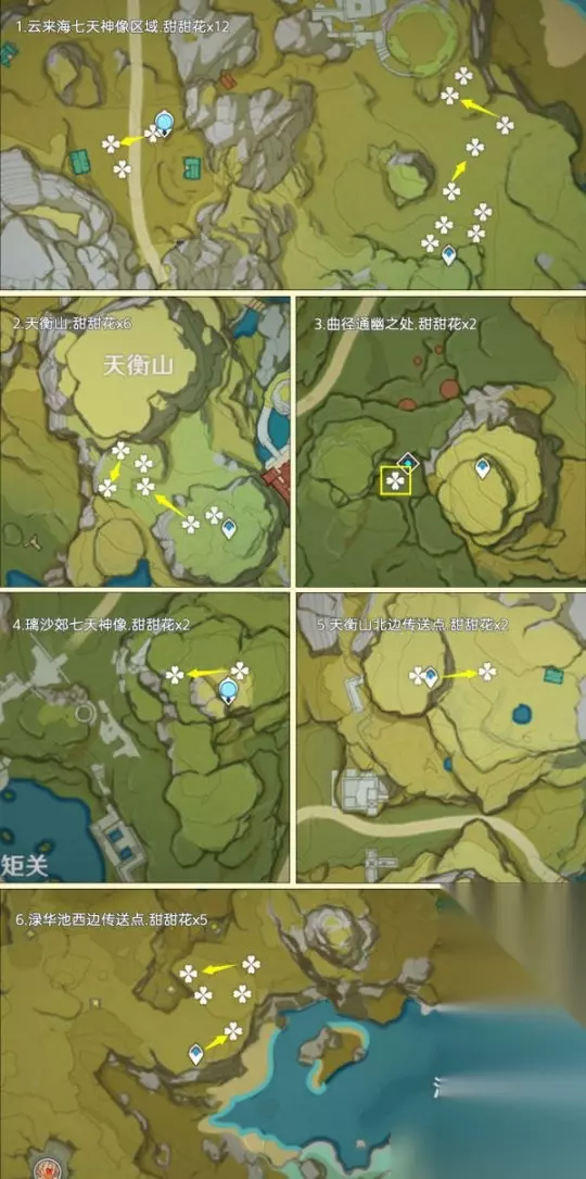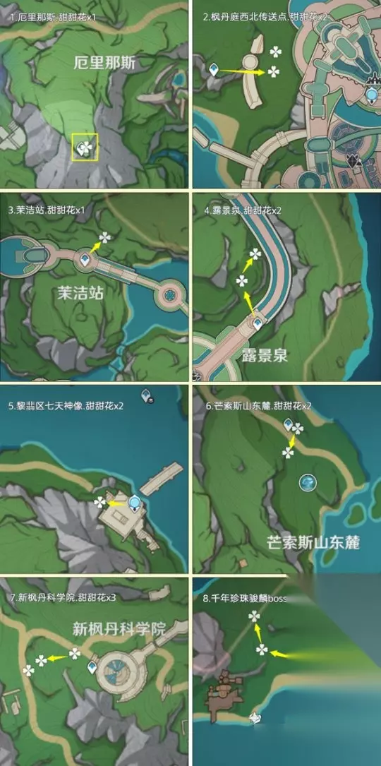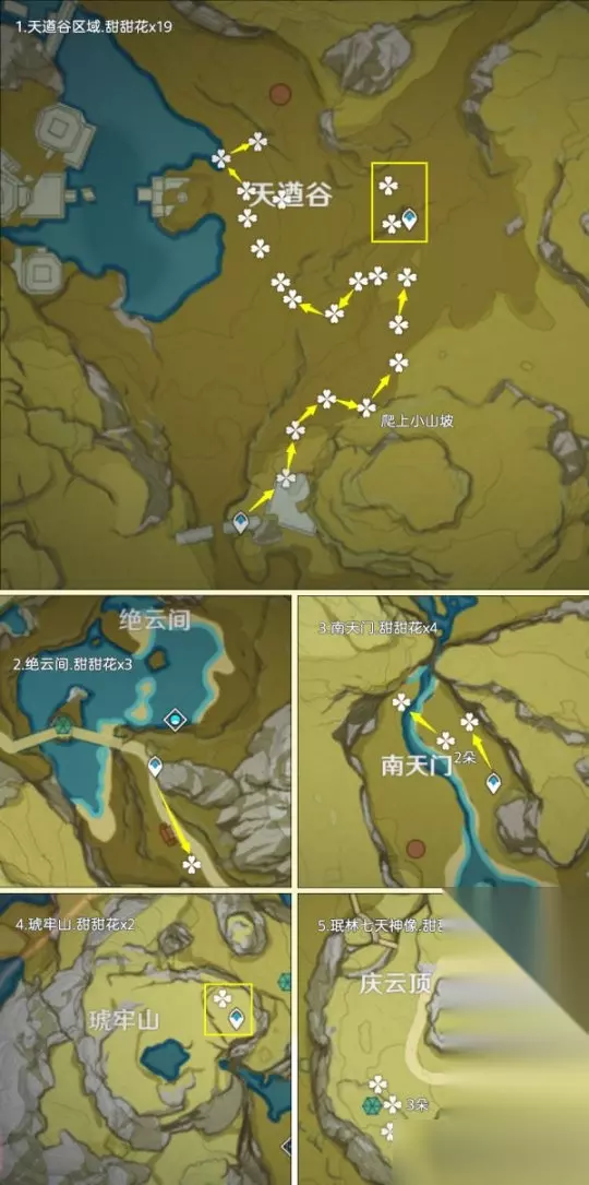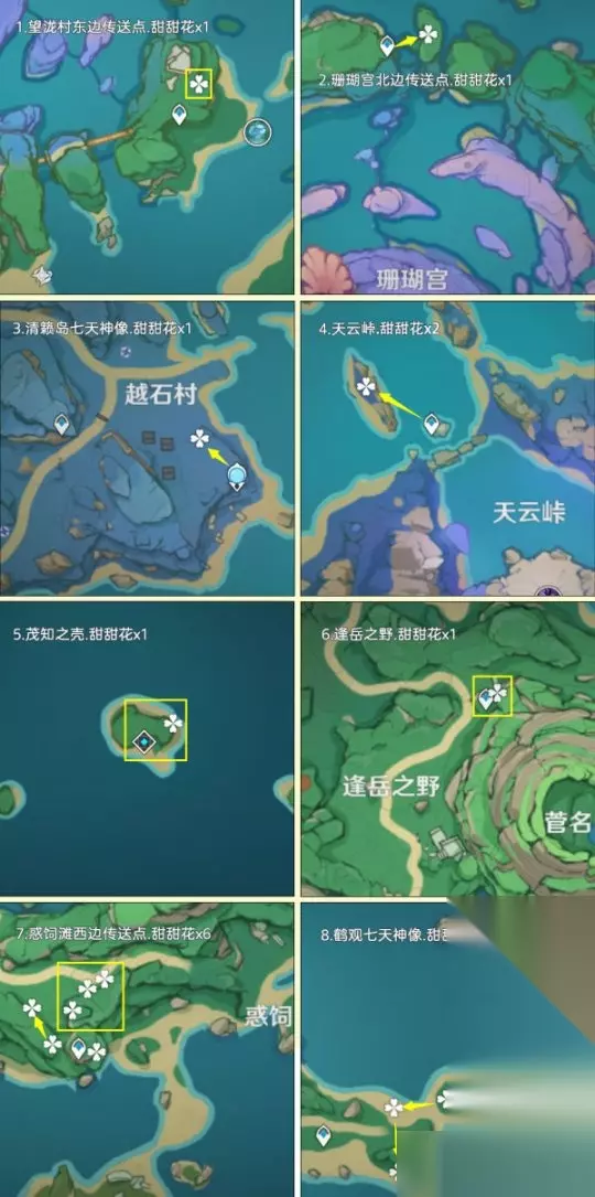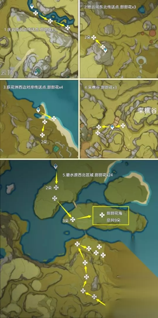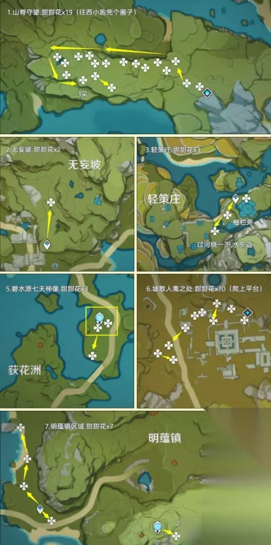 二、甜甜花采集篇 甜甜花点位广泛地分布在提瓦特全部区域内,其中高效率可采集数量为402朵,加上NPC购买10朵,总共最多可以获得402+10=412朵甜甜花 重要提示:1.未特意说出几个的均为1朵甜甜花;2.鱼钩标记为洞口/分支路线等,方便寻路 路线一