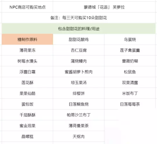 三、甜甜花/糖的购买篇 当前版本仅有1位NPC有出售甜甜花;另外还有8位NPC出售糖,每个10罐糖 1.蒙德城 「花语」 芙萝拉 每3天卖10朵甜甜花,仅在白天出现