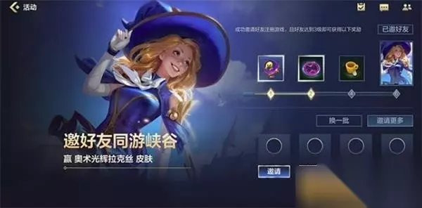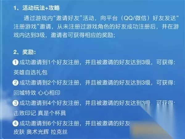 好友同游峡谷活动奖励 A、成功邀请1个好友注册,并再其等级达到3级时可以获得英雄自选礼包; B、成功邀请2个好友注册,并再其等级达到3级时可以获得回城特效——心心相印; C、成功邀请4个好友注册,并再其等级达到3级时可以获得击败印记——真是个杯具; D、成功邀请6个好友注册,并再其等级达到3级时可以获得拉克丝奥术光辉皮肤。