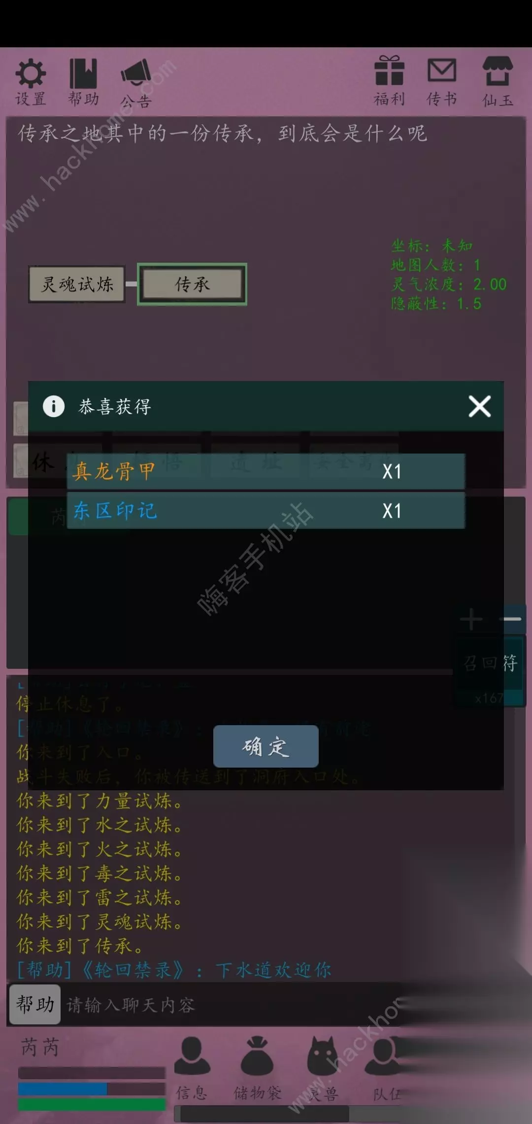 水我忘记保存了,属性都一样,就是抗性不同,传承前面几个都是先普攻再技能毕竟好打,灵魂传承是直接放技能,难度很高。 命运传承奖励4条路差不多是一装备,一丹药,一兽胎,一天道丹。 今天运气不好没有兽胎,呜呜呜。 命运传承还有中间还有一个隐藏的副本,叫隐蔽传承,难度非常高,比命运传承难2,3倍,建议组队或者巅峰前往。
