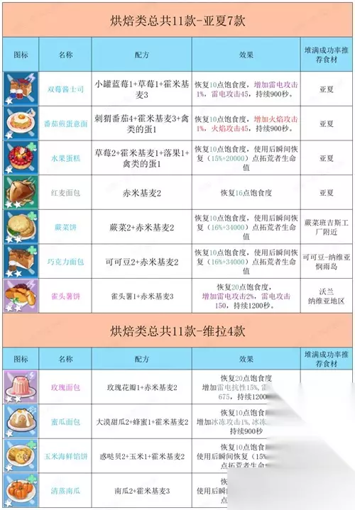 幻塔当中玩家可以使用一些不同的料理来增加一些buff效果,并且解锁食谱还有额外的奖励,所以很多的玩家都十分的好奇到底有哪些食谱,所以小编今天给大家整理了最新的食谱配方大全,希望能帮助到大家。 2023幻塔自研食谱配方表 使用方式:寻找烹饪锅,点击右上角图鉴查看缺的,点击自研,堆满成功率到100%即可表格也都标明。 目录: 1、亚夏:六十六道菜谱、维拉:三十二道菜谱、无序深渊:二道菜谱; 2、六十八种食材位置一览表 *注:本期内容最后会放上所有食材分布区域一览表方便大家获取食材。 一、烘焙类食谱:
