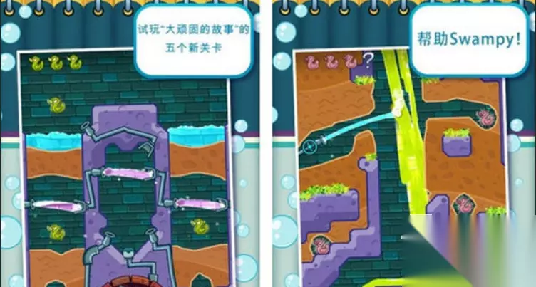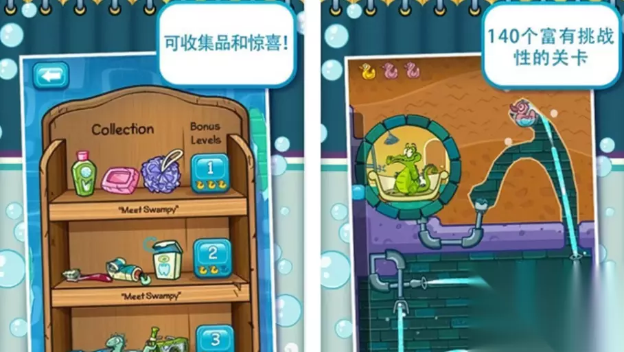 这是一款非常快乐的休闲益智类手游,热爱干净的小鳄鱼住在深不见底的石头深坑之中,他需要洗澡,然而清澈的水流需要经过异常复杂的道路才能顺利流入小鳄鱼的房间……玩家需要让清澈的河水流入小鳄鱼的房间,让小鳄鱼顺利洗澡,游戏才可以通关。