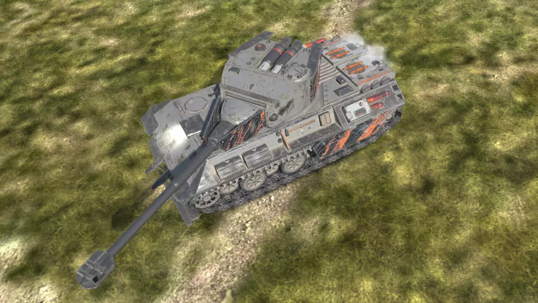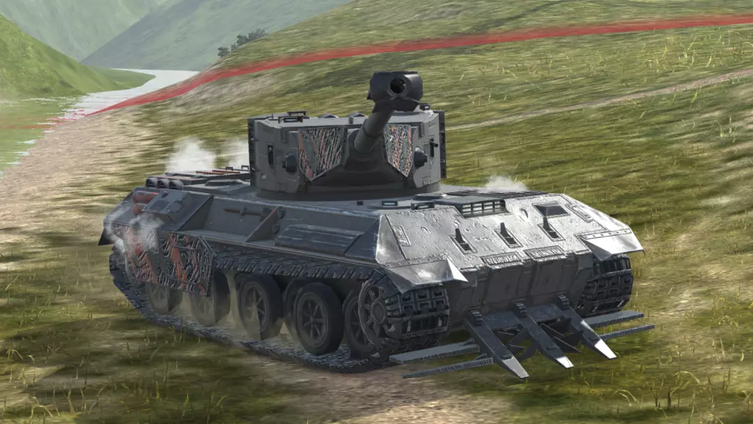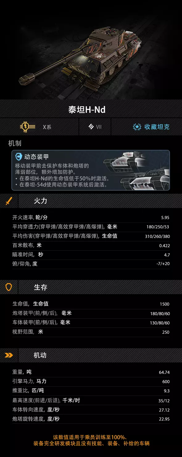 泰坦H-Nd的动态装甲机制的激活方式不同,当生命值低于50%时自动激活,且在该次战场中永久存在。覆盖区域包括炮塔两侧及车体前部。炮塔基础装甲为180/80/60,车体基础装甲为130/80/60。开火后,可通过左右摆动炮塔来有效减小弱点暴露。配合7度俯角与激活动态装甲机制,防御能力将得到显著提升。