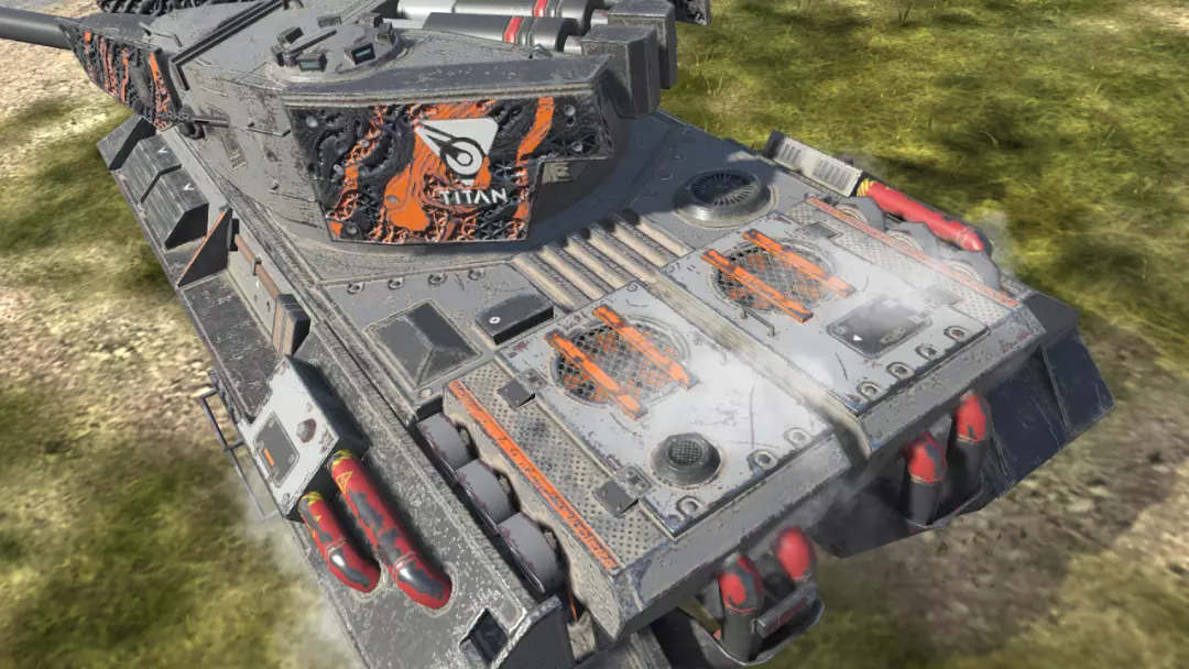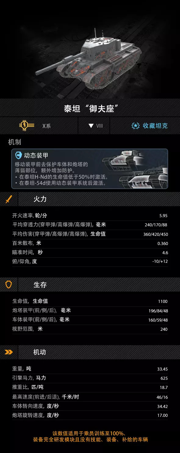 其独特的动态装甲机制可主动激活,激活后,可减免10%的所受伤害。动态装甲主要覆盖于炮塔两侧、首上区域以及两侧履带部位。炮塔基础装甲为196/84/48,车体基础装甲为160/59/48。激活动态装甲后,泰坦“御夫座”能够有效抵御同级坦克的攻击。由于侧面履带同样覆盖动态装甲,实战中可通过小角度卖侧,进一步提升生存能力。