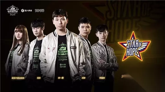 (从左至右选手依次为:sc电竞少爷、sc电竞阿灿、sc电竞阿森、sc电竞新酒、sc电竞黑白) Star of hope: 由明星选手岛屿领衔的Star of hope战队作为此次赛事的大热门有着一大批的忠实粉丝。球宝们的关注即使压力也是动力,Star of hope誓要在大家的关注下走向辉煌。 参赛宣言:Star of hope 与你同在