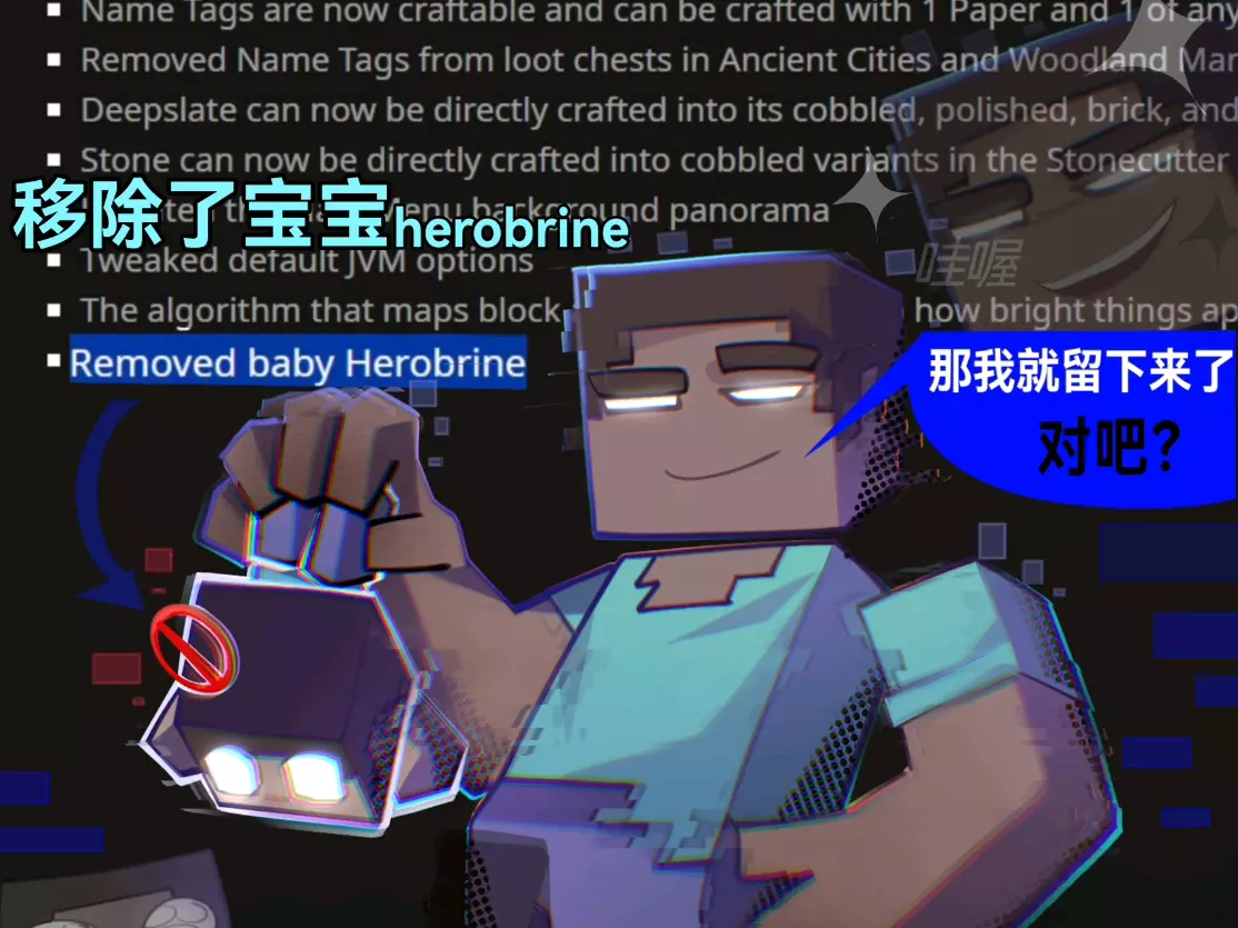 这篇帖子围绕沙盒游戏《我的世界》展开,提到官方曾在更新中移除了baby Herobrine,而此前官方曾否认Herobrine的存在,同时还介绍了该游戏的其他更新内容,如优化幼年生物模型、调整命名牌获取方式等。