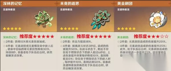 原神艾梅莉埃圣遗物选择推荐 一、圣遗物套装推荐 1、【未竟的遐思】四件套(首选) 如果你希望充分发挥艾梅莉埃在燃烧反应中的持续伤害优势,【未竟的遐思】四件套将是最契合的选择。该套装在角色造成燃烧反应后可获得强力的增伤加成,燃烧状态的高覆盖率让艾梅莉埃几乎可以常驻该加成,是最具性价比的核心搭配。 2、【深林的记忆】四件套(备选) 如果队伍中没有其他角色佩戴【深林】四件套,艾梅莉埃也可以考虑选择这套。其降低敌方草元素抗性的效果对团队草系输出有极强的提升作用,尽管艾梅莉埃自身并非以草直伤为主,但在特定队伍体系中能起到有效的协同作用。 3、【黄金剧团】四件套(过渡) 当前期资源有限或已有成型的【黄金剧团】套装时,也可以暂时使用其作为过渡选择。该套装能显著提升元素战技伤害,对于依赖战技的艾梅莉埃来说仍然有一定增益。但需注意,这套装无法强化其固有天赋或爆发技伤害,适合早期使用,后续建议更换为前两者之一。