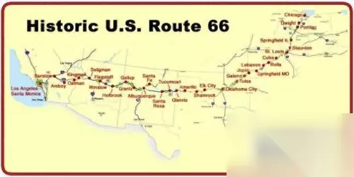 而这条享誉世界的经典公路 也被美国人亲切的唤作“母亲之路” 从伊利诺伊州的Chicago 到加利福尼亚州的Santa Monica 途径八州之地 全长2448英里,约3939公里