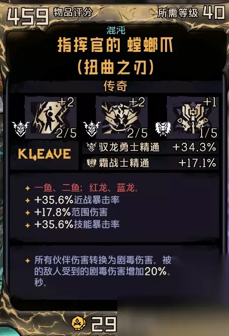 《小缇娜的奇幻之地》中好用的传奇职业护甲是很多的,螳螂爪就是其中一个,红字“一鱼,二鱼;红龙,蓝龙”的效果就是伙伴伤害转为剧毒伤害,被伙伴伤害的敌人受到剧毒伤害增加20%持续6秒。