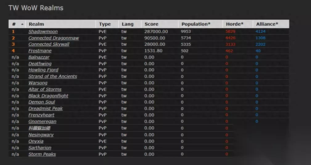 最新人口数据一览(魔兽世界人口普查简介)"> 这是外服数据网站统计的亚服正式服日常活跃角色数量,可以看到4个服务器加在一起也只有两万个日常活跃角色,这其中还包含工作室的脚本和一人玩多个角色的情况。 相比正式服的一目了然,怀旧服的玩家人数统计就比较麻烦了,毕竟怀旧服并没有连接API,我们也只能从多个方面的数据来推测。
