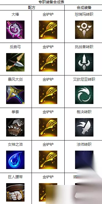 云顶之弈S9转职合成表一览 1、艾欧尼亚转职=铲子+大剑; 2、恕瑞玛转职=铲子+大棒; 3、德玛西亚转职=铲子+斗篷; 4、诺克萨斯转职=铲子+腰带; 5、挑战者转职=铲子+攻速; 6、法师转职=铲子+水滴; 7、主宰转职=铲子+锁子甲; 8、裁决战士转职=铲子+拳套;
