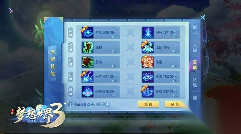 天赋技能开放 等级限制:达到30级等级达到30级后将开启天赋技能页面。每五级开启一组天赋技能,每组有2个天赋,可选择其中一个进行装备。