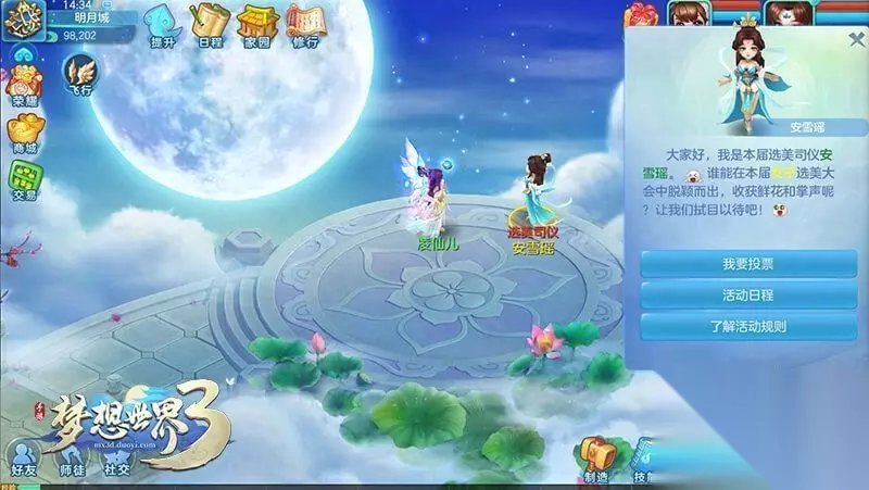 选美大赛 等级限制:达到35级在明月城找到大月亮下面的选美司仪安雪瑶,上传你的照片即可报名参加选美大赛。大赛将持续两周,票数排名前10的玩家获得称谓奖励,前三名将获得选美气泡奖励,第一名的玩家可获得头像券。