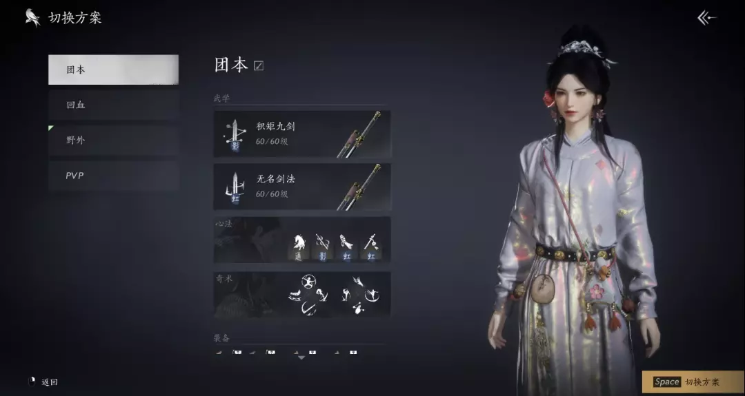 然后是搭配,这里主要提供给大家一个思路。你需要根据你玩的流派来搭配装备和心法。我自己是有四套方案,但是这四套方案区别无非就在心法和奇术上(因为没时间肝对应流派的套装)。