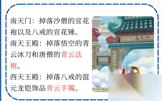 南天王殿:掉落悟空的青云冰刀和唐僧的青云法袍。青云冰刀和青云法袍具有较高的属性,能让悟空和唐僧在战斗中更具优势。 西天王殿:掉落八戒的混元龙铠以及饰品青云手镯。混元龙铠为八戒提供了强大的防御力,青云手镯则可以增加角色的属性。