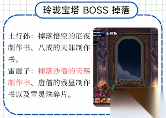 玲珑宝塔 BOSS 掉落 土行孙:掉落悟空的厄夜制作书、八戒的天罪制作书。通过制作书可以制作出强大的武器,提升角色的实力。 雷震子:掉落沙僧的天殇制作书、唐僧的残昼制作书以及雷灵珠碎片。制作书可以制作出强力的武器,雷灵珠碎片可以合成雷灵珠,为装备增加属性。