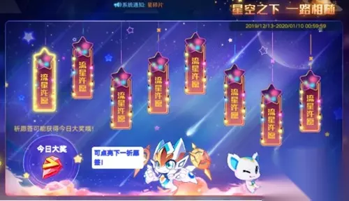 活动时间:2019年12月13日——2020年1月10日维护更新前 消耗星币,豪华大礼免费送!大量奖励等你领,最高送自选金色金轮套装! 【最后一周】流星祈愿签