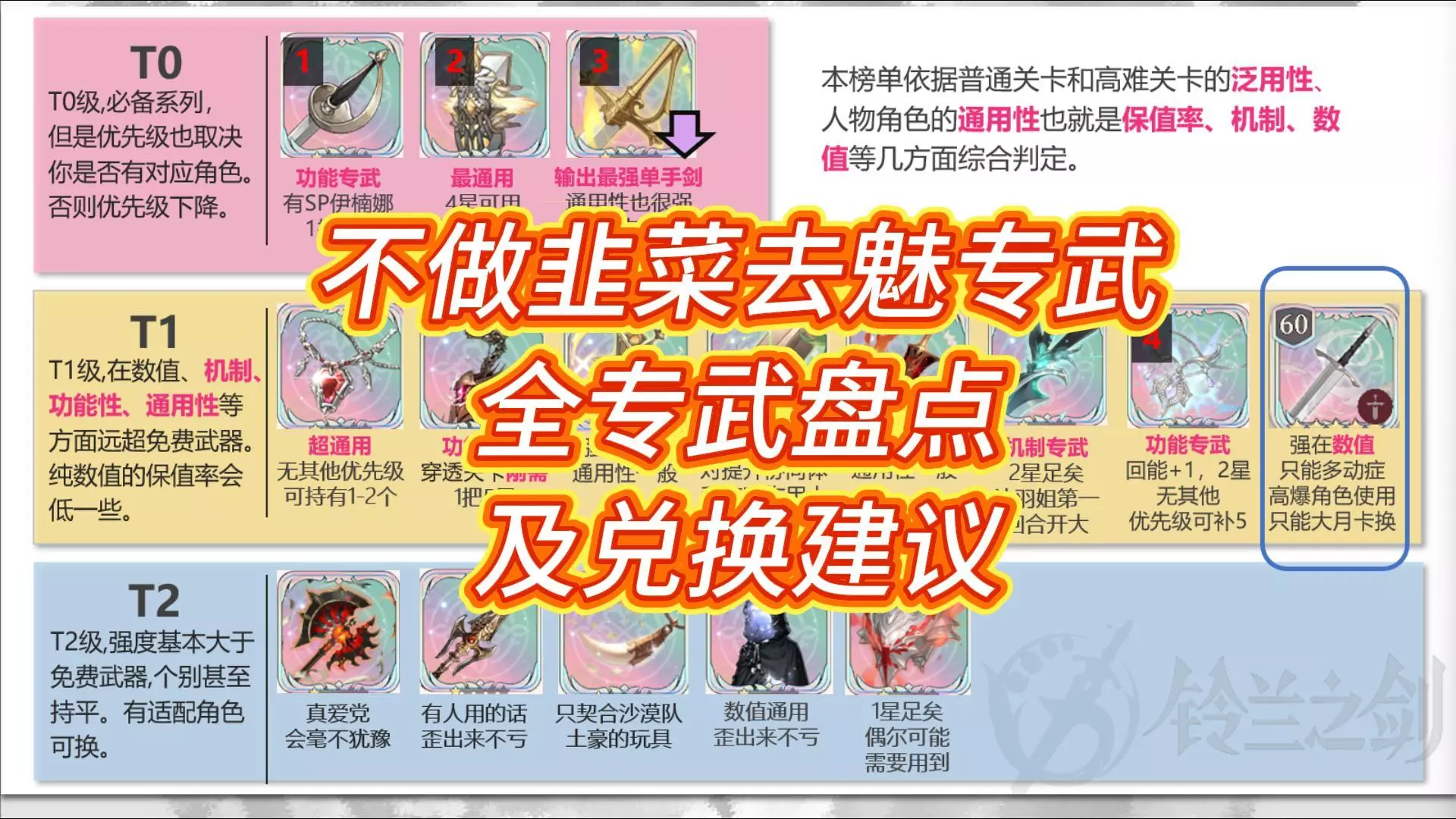老寒专门做了一期长篇视频内容,盘点铃兰之剑的全部专武。对于绝大部分0氪和月卡来讲,专武能不碰就不碰。抽人远大于抽专武。高效避坑,提升游戏体验!