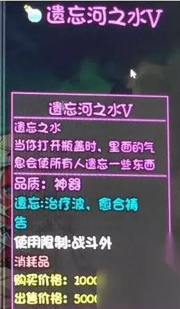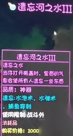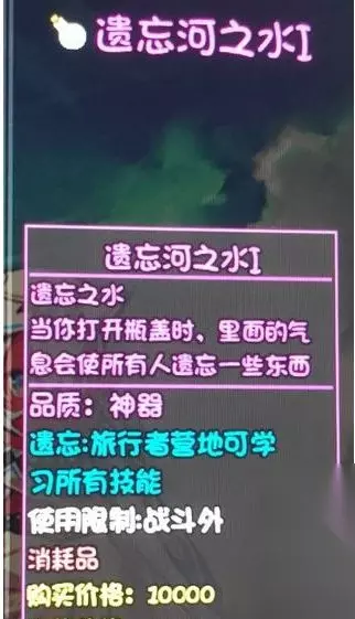 大千世界中存在一种道具可以让角色遗忘技能,类似于DNF中的遗忘河之水,名字也和遗忘河之水同名,很明显作者是在致敬DNF中的道具,但是遗忘河之水在大千世界中有6中类型哦,它们分别都在哪里呢?一起来看看吧。 大千世界遗忘河之水位置介绍 遗忘之水一共6种 分别是1-6型 1型 在冒险者营地,卖奥利给的大叔哪里,遗忘冒险者营地技能