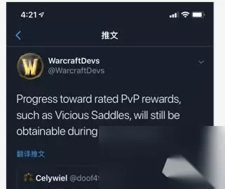 但是,没有领取的箱子在新版本8.2上线时领取,则可以获得2500能量 总结:目前大部分玩家会攒3个巅峰声望箱子(领一个,声望达到19999/10000,也就是两个未领取的箱子),目前有6个声望,相对于来说也就砍掉了6*2500=15000的能量,但是还有30000的能量可以获取,没做的朋友加油哦。 官方推特:休赛期依然可以获得邪气鞍座 8.2上线后我们还不能够参与新赛季,需要经历两周的准备期。那么这段时间内没有打满进度的话还能获得邪气鞍座么?有玩家就资讯了一下官方,官方回复是可以获得的。 美服也有人问。
