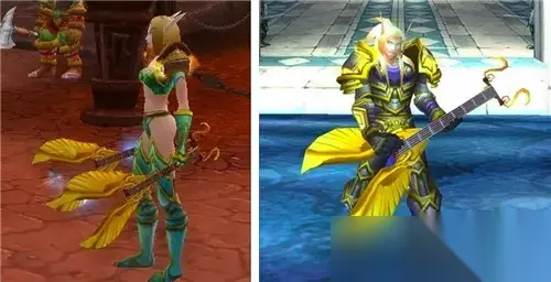 后来,牛头人酋长乐队的另外一名成员的武器也被暴雪做成了玩家可用的版本,它就是【凤凰王的金曦琴】,跟上述的奥金利斧一样有一个使用效果,可用变身成为T6套的血精灵圣骑士,也是非常拉风的存在,同样是黑市顶价拍走的常客。