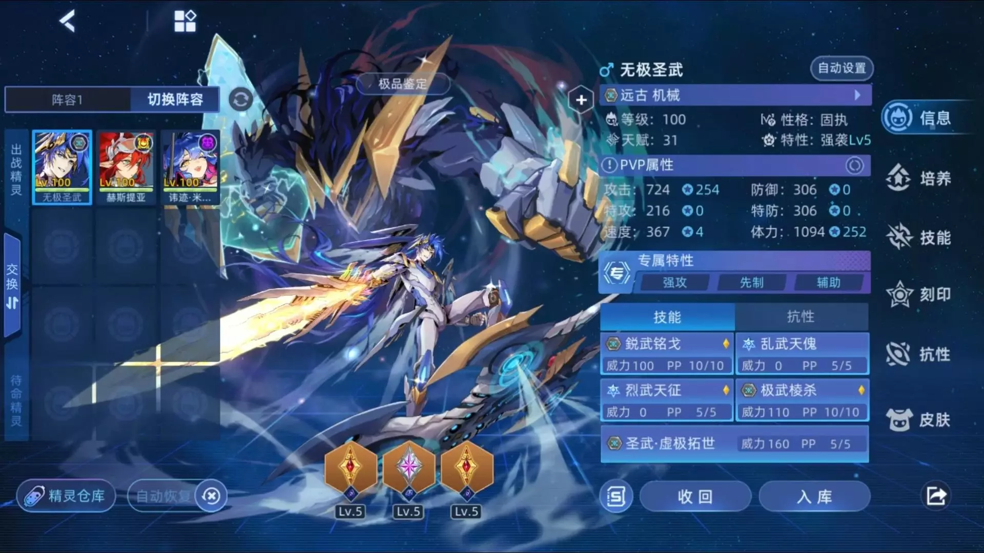 性格固执 特性强袭/坚硬/瞬杀(不推荐毒因为魂印效果)攻体255(攻速255也可 放不太出来目前主播自己给了攻体)双K1303+V1003 宝石建议双攻击给威力…