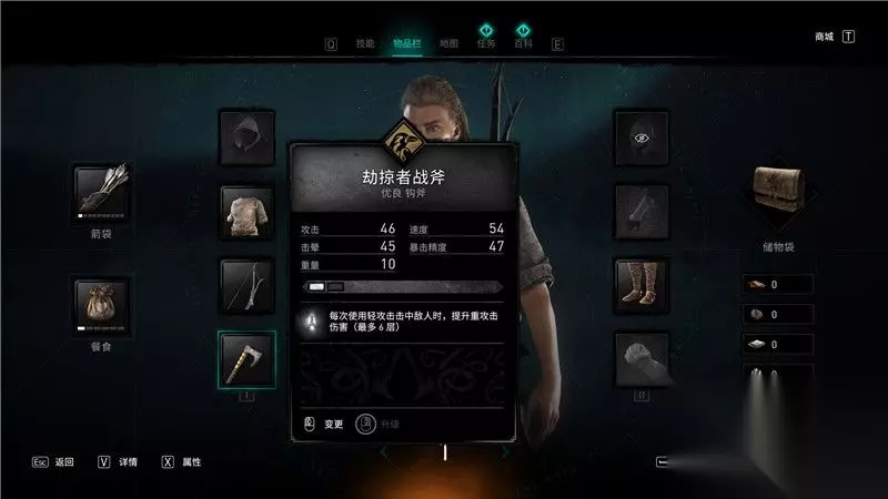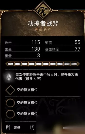 «12345678910»友情提示:支持键盘左右键"←""→"翻页 武器篇 (注:参数部分为武器的神话级数值) 钩斧 掠夺者战斧(Raider Axe) 派系:乌鸦 攻击:115 速度:55 击晕:130 暴击精度:77 重量:8 特效:每次使用软攻击击中敌人时,提升重攻击伤害(最多6层)
