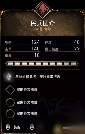«12345678910»友情提示:支持键盘左右键"←""→"翻页 民兵团斧 派系:熊 攻击:124 速度:48 击晕:140 暴击精度:77 重量:10