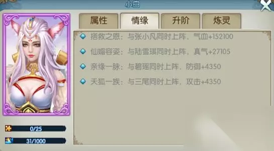 阵灵组合:张小凡, 碧瑶, 鬼厉, 道玄真人, 陆雪琪, 小白 情缘条数:15 情缘属性【躲闪】:7800 情缘属性【攻击】:9020 情缘属性【暴击】:10840 情缘属性【暴伤】:1900 情缘属性【防御】:10470 情缘属性【暴抗】:15600 情缘属性【命中】:10840 情缘属性【气血】:152100 情缘属性【真气】:27105 附加道法:702824 二、小白土豪搭配2 阵灵组合:张小凡, 碧瑶, 鬼厉, 陆雪琪, 三尾, 小白 情缘条数:14 情缘属性【躲闪】:7800 情缘属性【攻击】:10150 情缘属性【暴击】:10840 情缘属性【防御】:7250 情缘属性【真气】:39155 情缘属性【暴伤】:600 情缘属性【气血】:152100 附加道法:651135 三、小白平民搭配: 阵灵组合:张小凡, 陆雪琪, 林惊羽, 六尾, 三尾, 小白 情缘条数:11 情缘属性【攻击】:9180 情缘属性【防御】:7730 情缘属性【气血】:321100 情缘属性【真气】:39155 附加道法:627670
