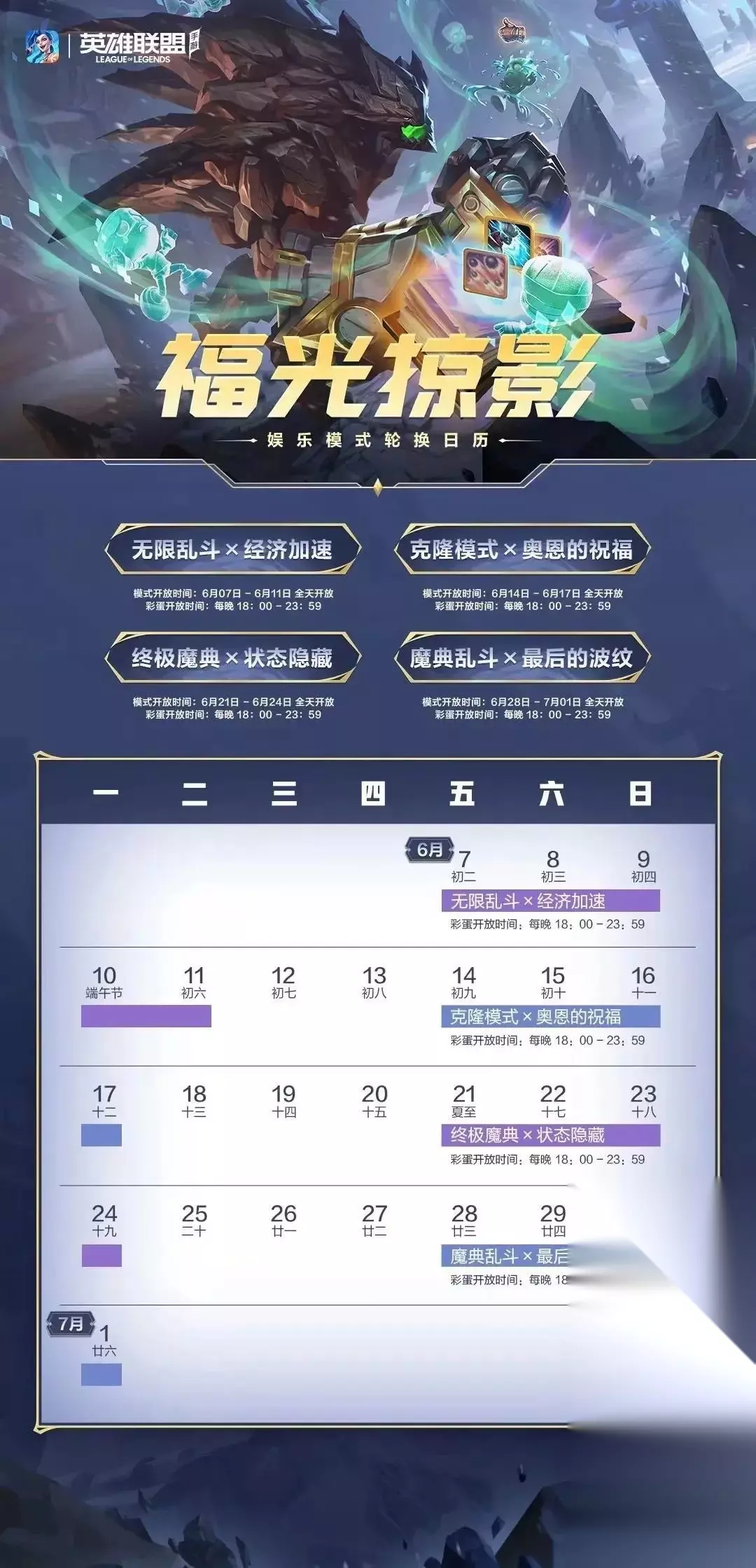 活动:峡谷日历 登录有礼 时间:截止至6月30日 奖励:深渊之骰(3天),心花怒放,任务卡,皮肤姿态甄选宝箱,史诗皮肤限时体验自选奖励