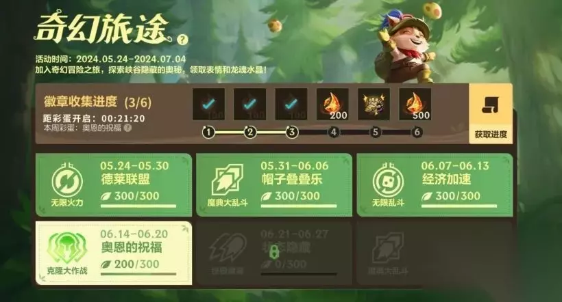 加入奇幻冒险之旅,探索峡谷隐藏的奥秘!奇幻旅途活动第四站火热进行中,截止至7月4日,完成活动任务,积攒能量收集徽章,即可将局内表情-哦耶!和龙魂水晶*2800好礼收入囊中~