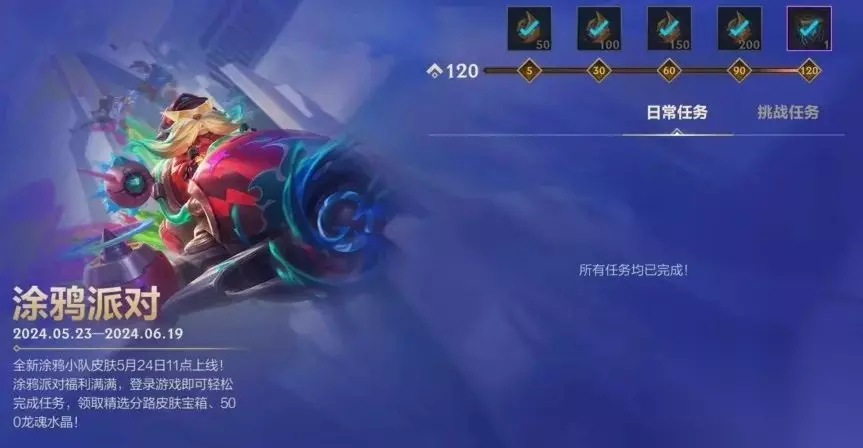 涂鸦派对 领分路皮肤宝箱 涂鸦派对活动倒计时2天!截止至6月19日23:59分,召唤师参与活动完成任务,即可领取精选分路皮肤宝箱和龙魂水晶*500好礼~