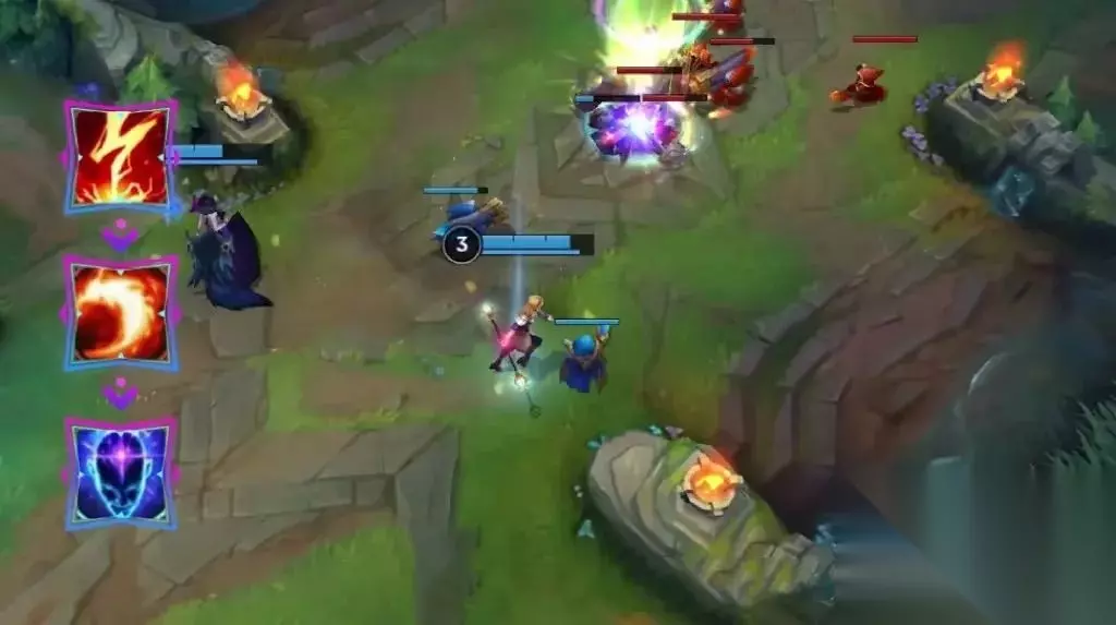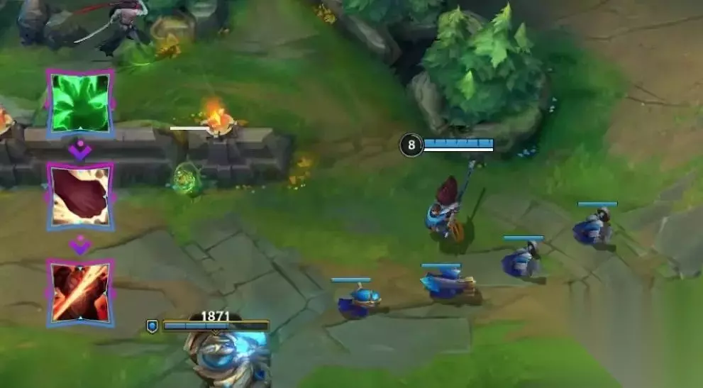 对线期,吉格斯可以先配合崔丝塔娜,通过E(3)技能的被动效果快速清线,取得等级领先。等到兵线进塔,则做好视野,准备开启拆迁模式!