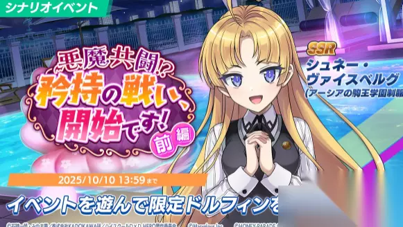 透过活动限定任务可以获得合作 Cosplay 海豚 SSR 朱涅・韦斯伯格(爱西亚的驹王学园制服) シュネー・ヴァイスベルグ(アーシアの驹王学园制服) ;合作衣装 莉雅丝・吉蒙里(驹王学园制服(莉雅丝)) リアス・グレモリー(驹王学园制服(リアス)) 以及 姬岛朱乃(驹王学园制服(朱乃)) 姫岛朱乃(驹王学园制服(朱乃)) 。