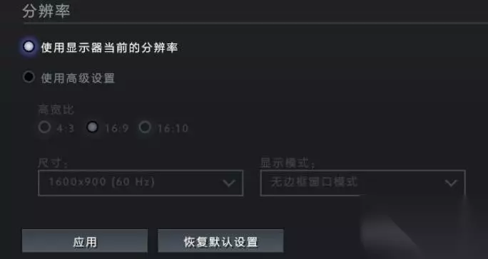 4、分辨率调整,是对游戏画面尺寸的一种调整方式,建议直接选择使用显示器当前的分辨率。这样就可以使游戏符合电脑显示屏画面大小。