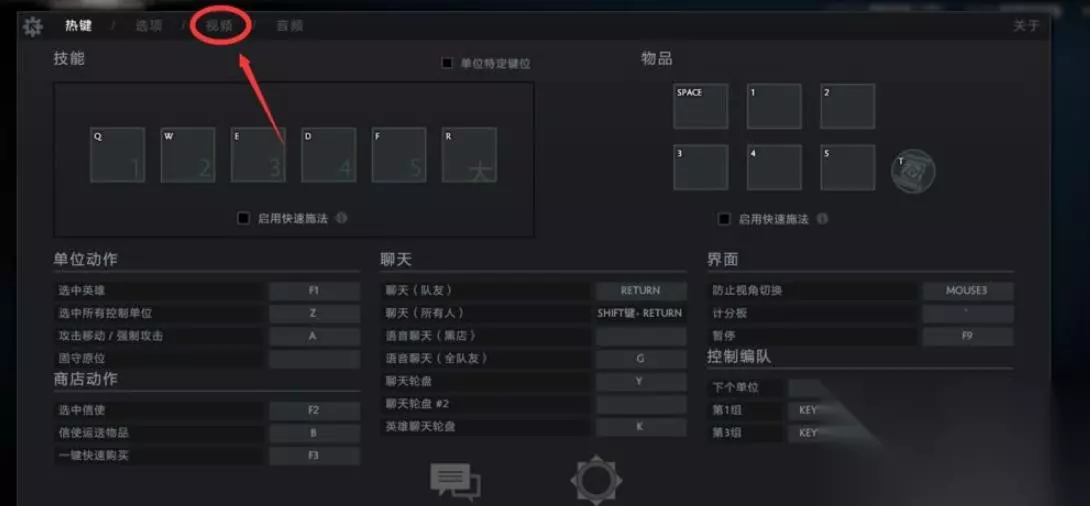 2、在DOTA2菜单设置中,找到最上面的视频菜单选项。