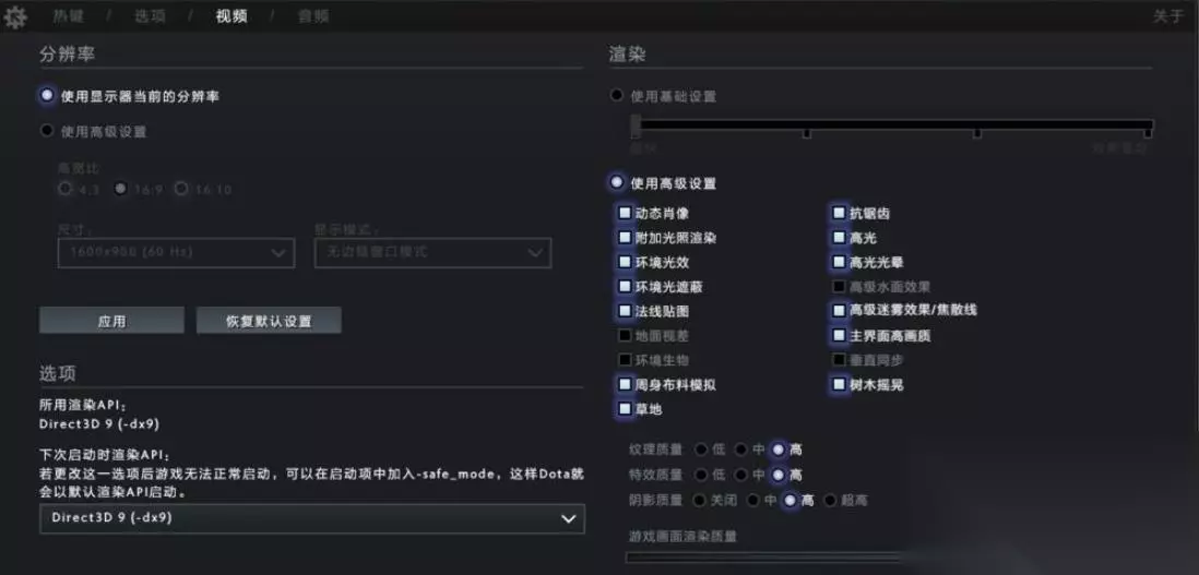 3、视频菜单中就是DOTA2游戏画质调整的详细菜单内容了,根据自身的电脑配置选择渲染质量。