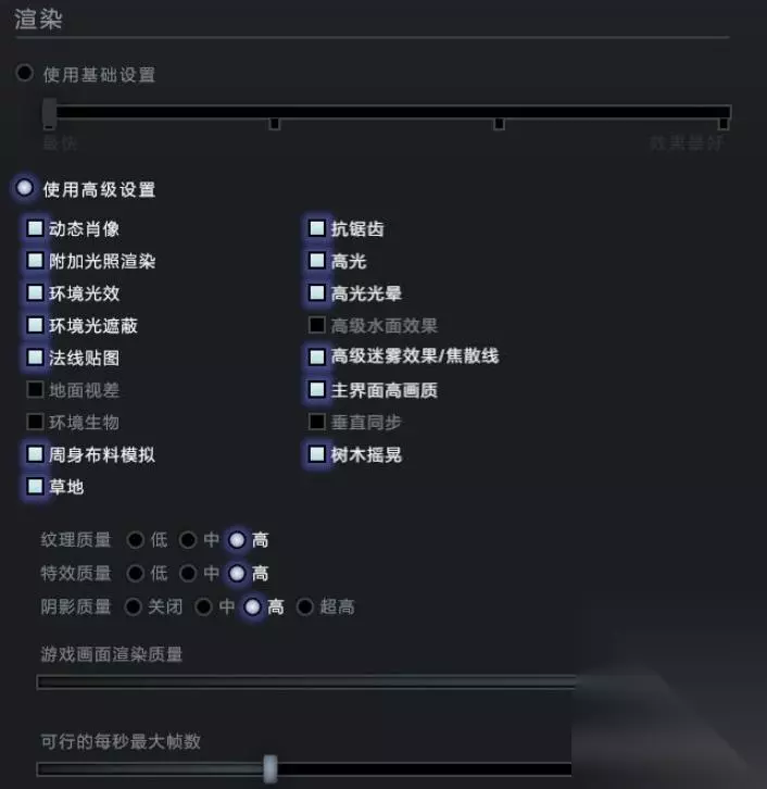 6、渲染还有另一种高级设置,里面有游戏画面中详细的参数设置,你想要什么可以根据这个参数仔细调整,最好画质就是全部勾选。