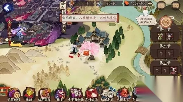 阴阳师林中鬼面隐线索怎么找? 八重樱烂漫,光照九重宫这条线索取自和歌,而当期作为宝图线索的时候,就可以提取出关键词“樱”和“宫”了。 所以对应的藏宝地点就如上图所示,是在一个有宫殿般的建筑旁边的樱花树下面,找到这个位置就可以开启宝藏。 这条线索还是比较容易理解的,当然除了推理分析以外,其实玩家还可以依靠指针的指引。所以拿到宝图之后再寻找埋藏地点还是很简单的,玩家只要能够拿到宝图应该就可以轻松完成任务,取得梦幻积分。 宝图会给出的线索并不是只有这一条,玩家拿到的宝图线索也可能会有林中鬼面隐、春光幻梦间、林藏逐雀鹯等等,分别会指向不同的藏宝地点哦。