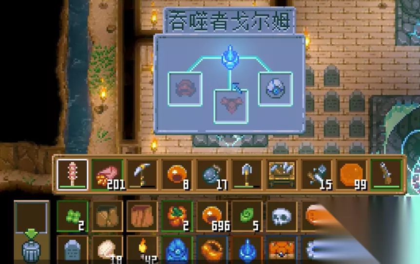 然而,获得探测器并不是一件简单的事。首先,你得打败游戏中的初始挑战——大史莱姆。这个体积庞大的黏液生物会掉落一个重要的道具:蓝色水晶。把水晶放入大史莱姆雕像内激活后,在工作台上便可制造出吞噬者探测器。材料收集起来并不困难,所以建议在砍下大史莱姆之后立刻行动。