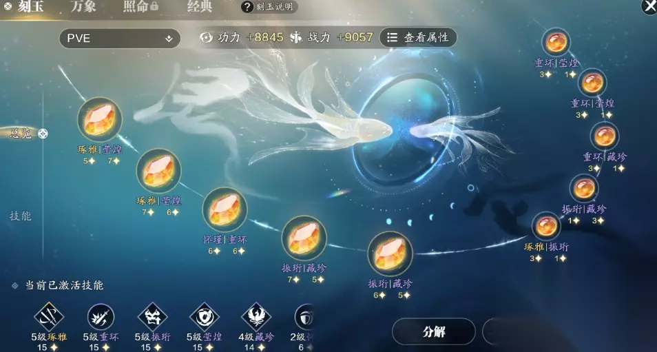 重环作用在于提升百分之六点五的暴击,莹煌能根据血量提供首领击破和抵御。尽量在鉴定时用金色神品,以便得到暴伤、破穴以及纯元攻等属性。阴玉可进行3加1或者2加2等自由组合,同样可用神品开出好的属性。八张万象中,玩家可为其用上建安加枭雄的常规组合方式。没有攒齐前者的情况下也可用唐传奇,至于万象相关技能一是可选用煌威。它可进入霸体状态中,并提升暴击、定力伤以及纯元伤。二是能够选择龙战,可提升团队友方的纯元攻以及破穴伤等等。