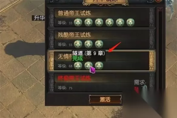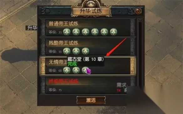 终极帝王试炼 终极帝王试炼并不需要完成大量的前置的迷宫,仅需一个女神祭品。 女神祭品可以在异界跑图的时候在迷宫中拿到。 最后到升华试炼激活台(第三、七掌城镇可以进入)打伊泽洛即可获得升华点。